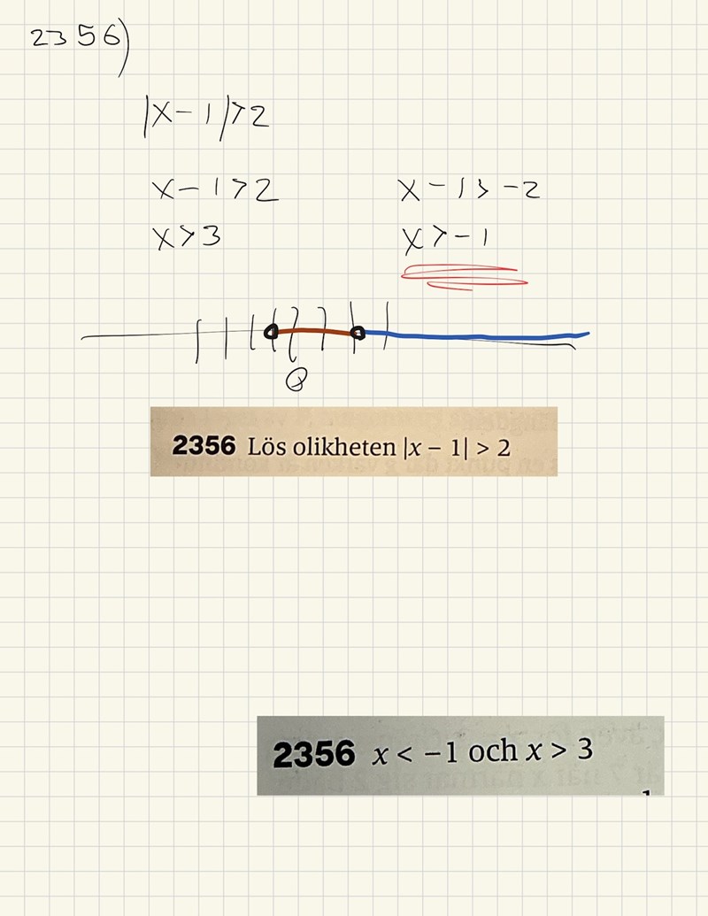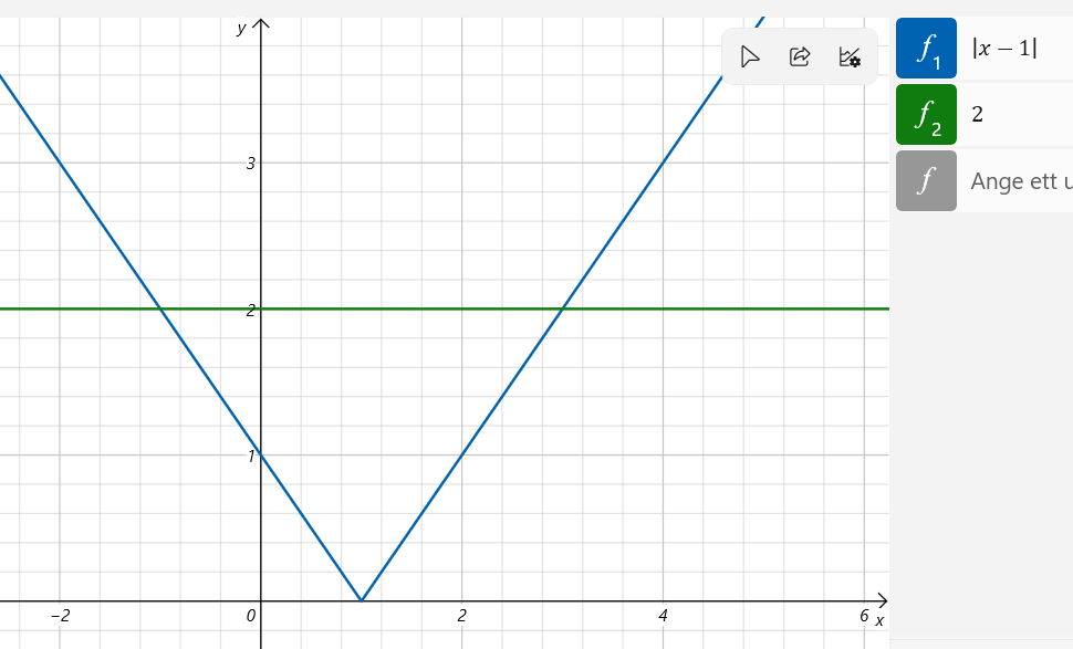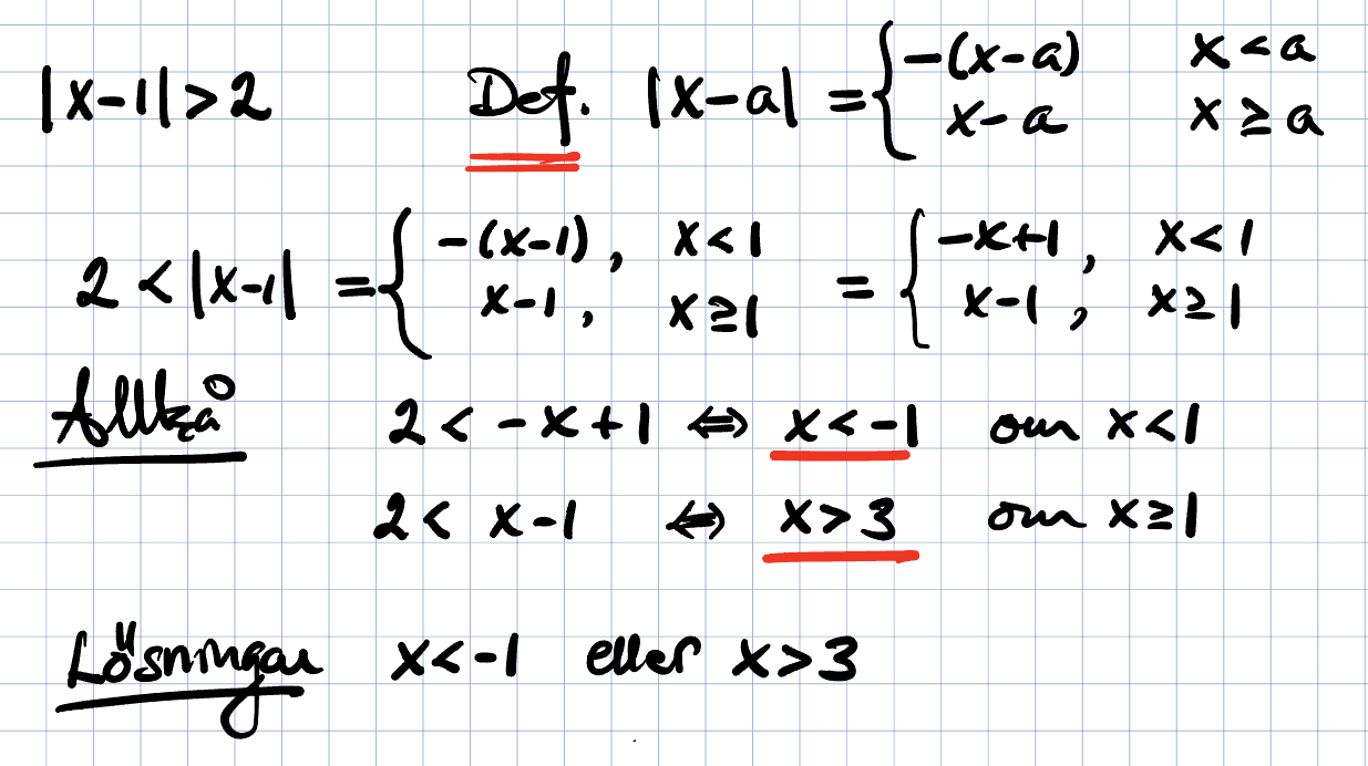 |x-1|>2 = "De x som ligger längre än 2 steg från 1".