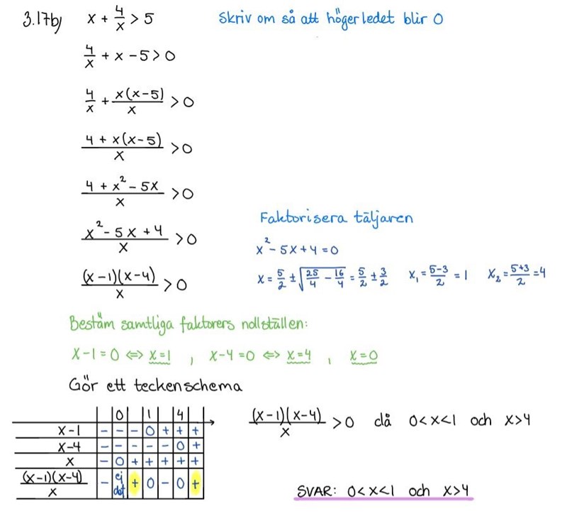 Så dina frågor, dem förstår jag inte riktigt. Vill veta när x är 0?? Du måste såklart ha med det fallet i teckenschemat, vänster led byter ju tecken när x passerar noll. Du har tagit reda på för vilka x som den givna olikheten är uppfylld. Det är när x ligger mellan noll och ett eller när x är större än fyra. Prova t ex med x = 2: du får 2+2 > 5, inte korrekt. Men med x = 1/2 blir vänster led 1/2+8 som är större än 5, helt ok.