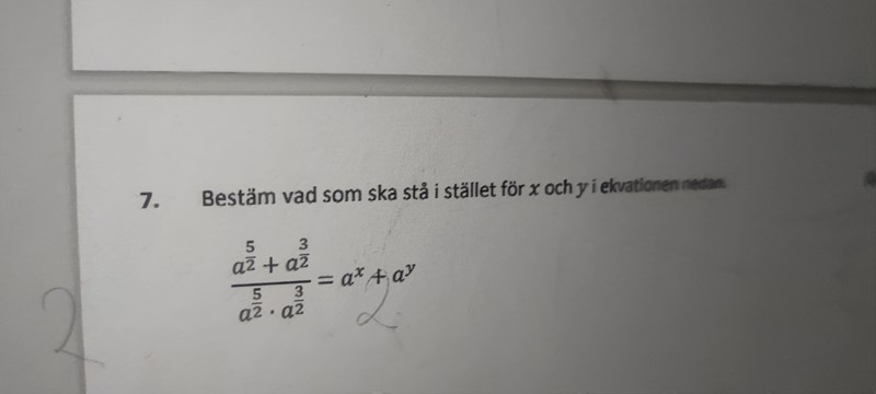 Jag har ju försökt annars had jag it frågat, jag faktoriserade ut a^2/3 från täljare och nämnare, kvar fick jag (a+1)/(a) ändan multiplicera a^x +a^y med a ändan fick jag att a^1 måste vara lika med a^2x altså är 2x = 1 och att 2y=0 Eftersom allt upphöjt med 0 är ett vill ba ha svaret för att se om de e rätt