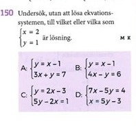 Jag bara testade att snabbt och enkelt sätta in x- och y värdena i ekvationerna istället för att räkna ut dem. Men jag vet inte om det också räknas som att räka. Jag fick det till att A och C hade den lösningen. Men finns det ett speciellt sätt man kan SE att en lösning funkar eller inte? Förutom att bara sätta in värdena? Man ska ju ändå inte räkna.
