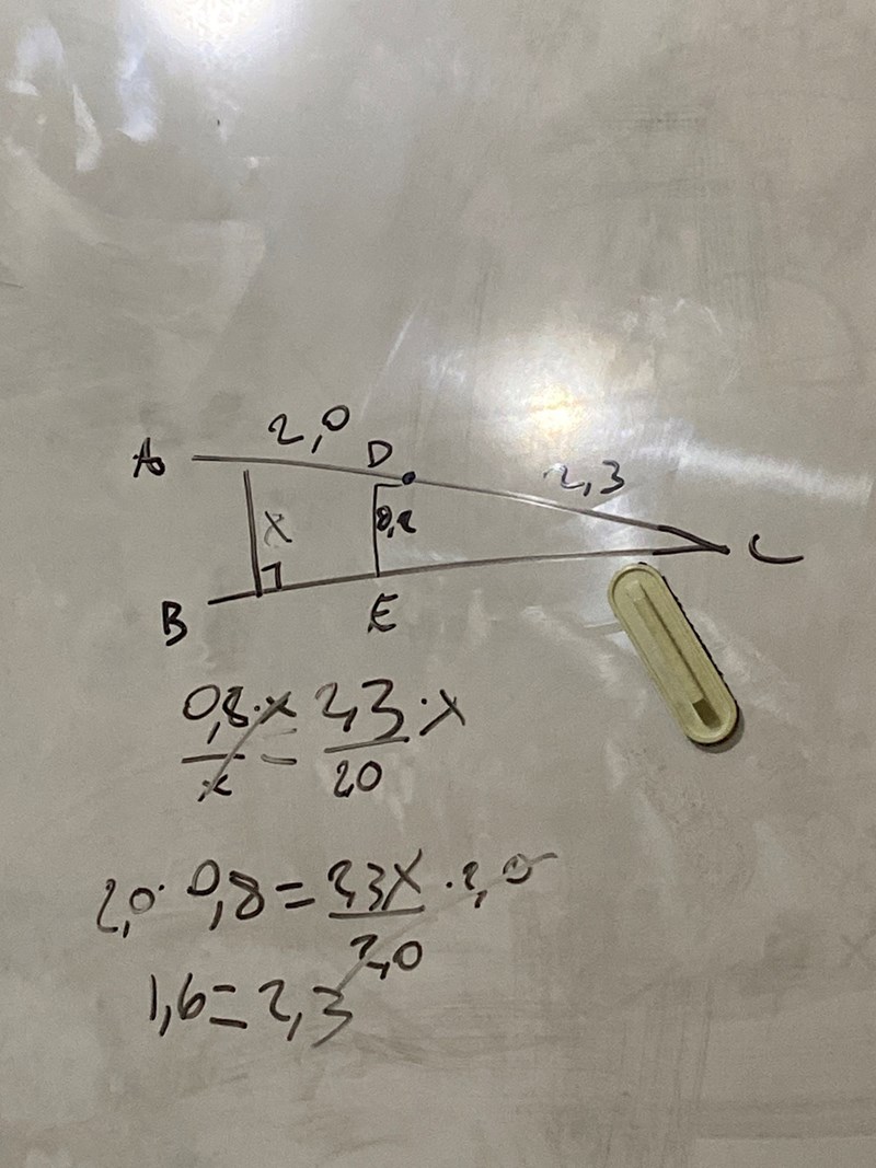 Om de två vertikala sträckorna är parallella (dvs om trianglarna är likformiga) så gäller det att 0,8/x = 2,3/(2,3+2,0)