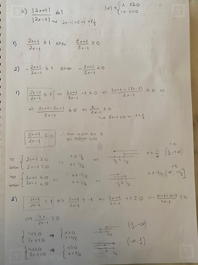 Del C: Om -1/2 < x < 1/2 så är täljaren positiv och nämnaren negativ, vilket betyder att kvoten < , vilket betyder att och då lyder olikheten . Eftersom nämnaren är positiv här så kan vi multiplicera med nämnaren utan att vända på olikhetstecknet och vi får då , dvs , dvs , vilket är sant i en del av detta intervall. Vi har här att olikheten är uppfylld för alla -1/2 < x 0.