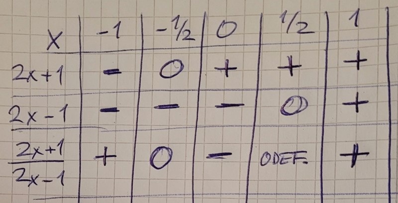 Börja med att konstatera att de intressanta "brytpunkterna" för täljaren 2x+1 och nämnaren 2x-1 är x = 1/2 och x = 1/2.