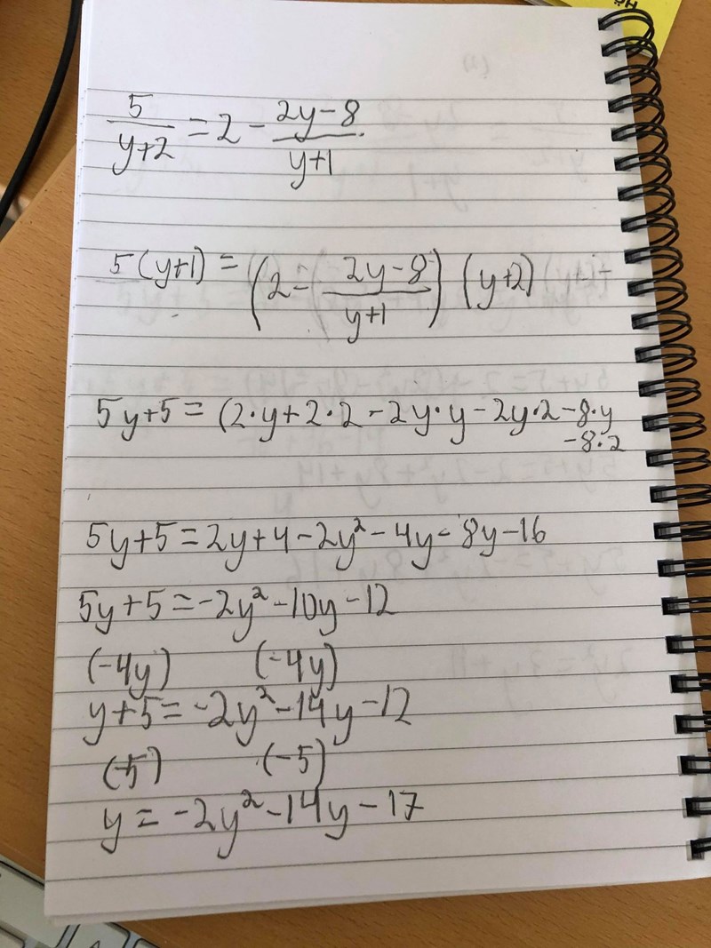 Vet inte vad jag gör för fel, försökt att multiplicera båda led med (y+2)(y+1) för att få bort nämnarna, men kommer aldrig fram till svaret y=(-3).