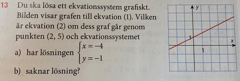 Jag behöver hjälp med hur jag ska gå fram vilken som är ekvation 2 om grafen går genom punkten (2,5) och ekvationssystemet har lösningen x=-4 och y=-1