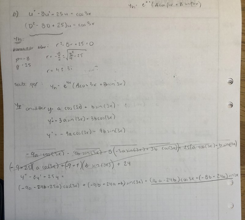 jag ska lösa diff.ekv: u''-8u'+25u=cos(3x) , men har fastnat. Såhär har jag börjat:
