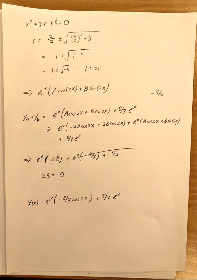 A=B=-1y(x)=yh+yp=e-x(-cos(2x)-sin(2x))+ex