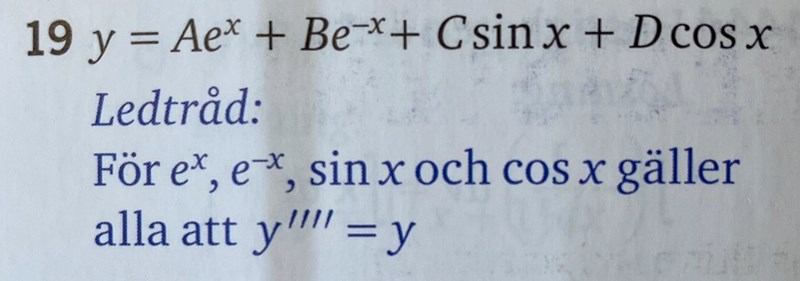 Derivera fyra gånger y=Ae^x+B^(-x)+Csinx+Dcosx