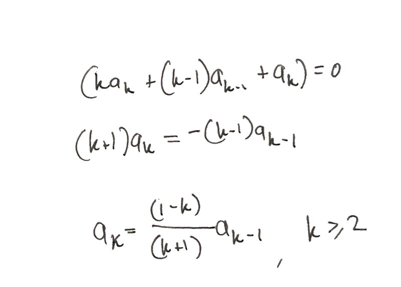 Jag tror jag upptäckte ett fel. I tredje raden efter insättning bör det väl vara (k-1) och inte (k+1) så då borde det bli som bilden under. Men jag är ändå inte säker på hur jag ska använda det för att lösa diff.ekvationen.