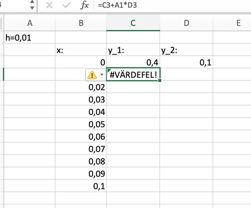 I A1 står det "h=0,01". Det kan inte multipliceras med D3.