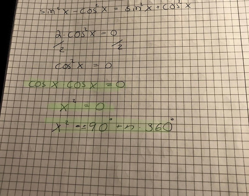Det är rätt så långt. Vad är cos(x) om cos2(x) = 0?