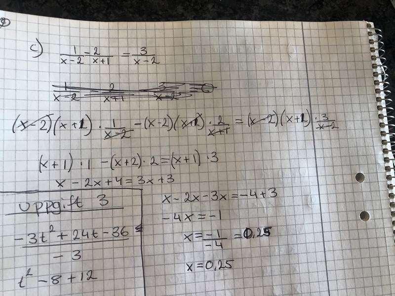 Jag ska lösa denna ekvation: 1x-2-2x+1=3x-2