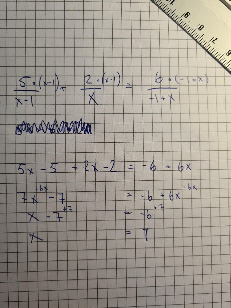 Sen multiplicerar jag in dem på samtliga men kommer fram till att x=1 vilket inte stämmer. Bifogar en bild på mitt kladd.