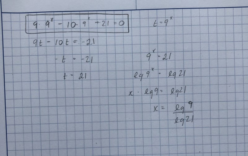 Nu har du slarvat till det, det ska ju inte vara lg(9)/log(21). Utan log(21)/log(9).