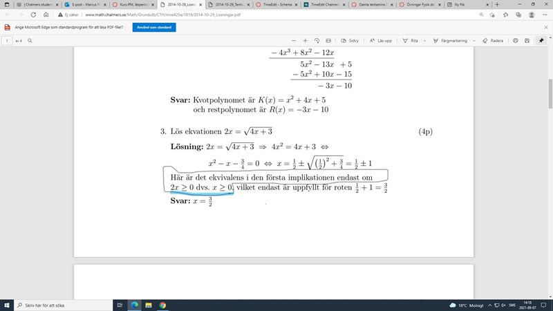 När man kvadrerar finns risken att man introducerar falska rötter, därav implikation och inte ekvivalens.