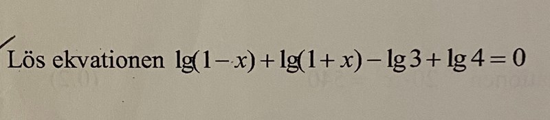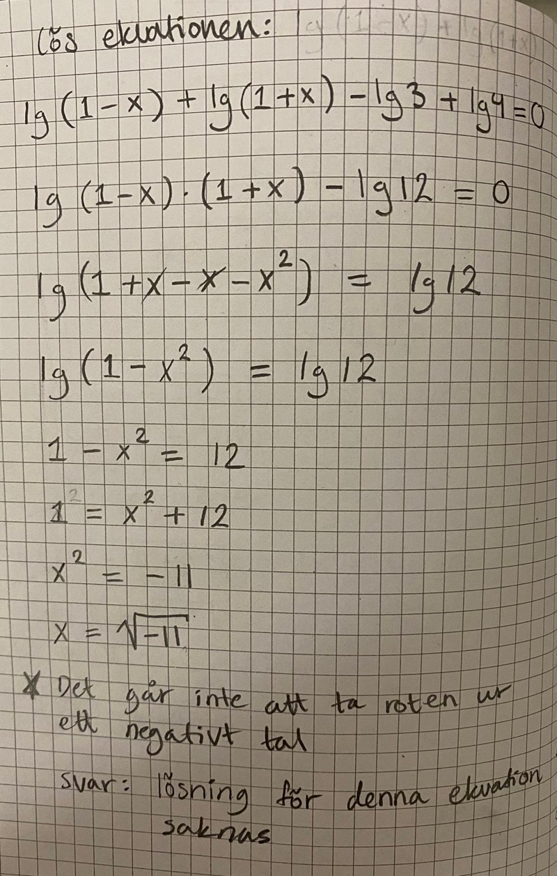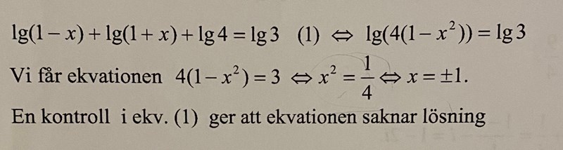 Facit har också skrivit att man ska utföra kontrollen i ekvation 1, vilket inte är den ursprungliga ekvationen utan den förenklade. Utför man knotroll med x=1/2 i ursprungliga ekvationen: lg(1-x) + lg(1+x) + lg(4) = lg(3) så kommer man fram till att HL = VL alltså att lösningen stämmer.