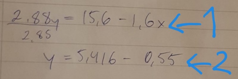 - Du har multiplicerat andra ekvationen med 2 men skrivit 2,88y istället för 2,8y. Därför dividerar du med fel tal i nästa steg.