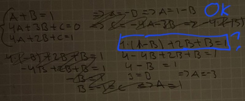 Att B = C fick du ju fram från din första felaktiga uträkning. Det behöver inte gälla.