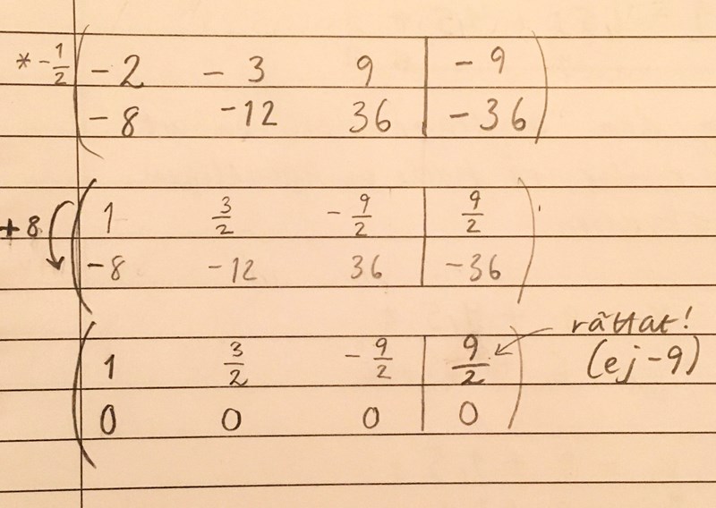 Ingen fara! Börja med GJ-elimination även här. Vilket ekvationssystem blir kvar?