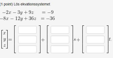 Vi har alltså lösningsmängden ovan, och vi har valt att sätta y = s och z = t. Om vi löser ut x får vi lösningssystemet: