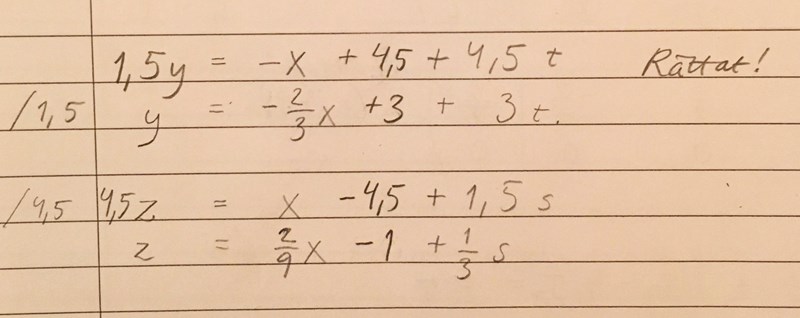 x har vi ju redan skrivit ett uttryck för ovan. Jag har försökt att lösa ut y och z ur detta uttryck och eftersom y=s och z=t så kan y respektive z kanske uttryckas som