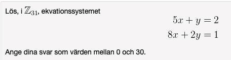 Du måste hitta ett heltal mellan 0 och 30 och multiplicera det med 2, så att resultatet har resten 3 när du dividerar med 31. Du kan gissa och pröva dig fram om det känns förvirrande.