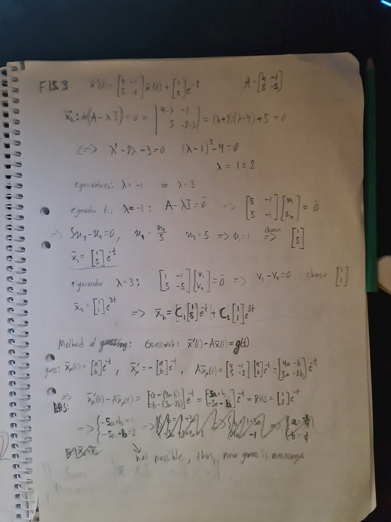 Det stämmer att jag ska ge svaret med både homogena och partikulära. Problemet är att det är två olika metoder jag har använt för att lösa problem, och enligt den information vi har fått bör vi komma fram till samma svar med båda metoderna. Den andra metoden "variation av parametrar", tror jag är korrekt. Men den första metoden "gissning", uppstår ett problem. Vad ska jag gissa? Jag har prövat Ingen av dessa tre ger något annat än eller liknande, vilket inte stämmer.