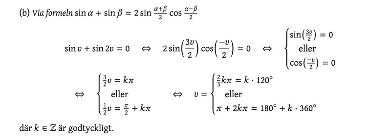 Längst till höger står det v = (stor klammer). På översta raden är det lösningen till ekvationen sin(v) = 0, dels i radianer, dels i grader (k är ett heltal). På nedersta raden är det samma sak med den andra lösningen.