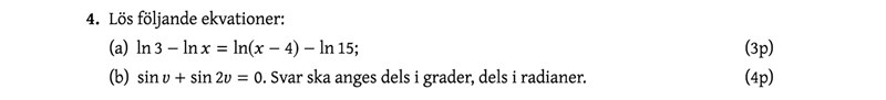Det finns ett antal "snälla" vinklar vars sinus- och cosinusvärden man förväntas känna till exakt. Hyggligt nog finns de med i den formelsamling man får ha med sig på nationella proven.