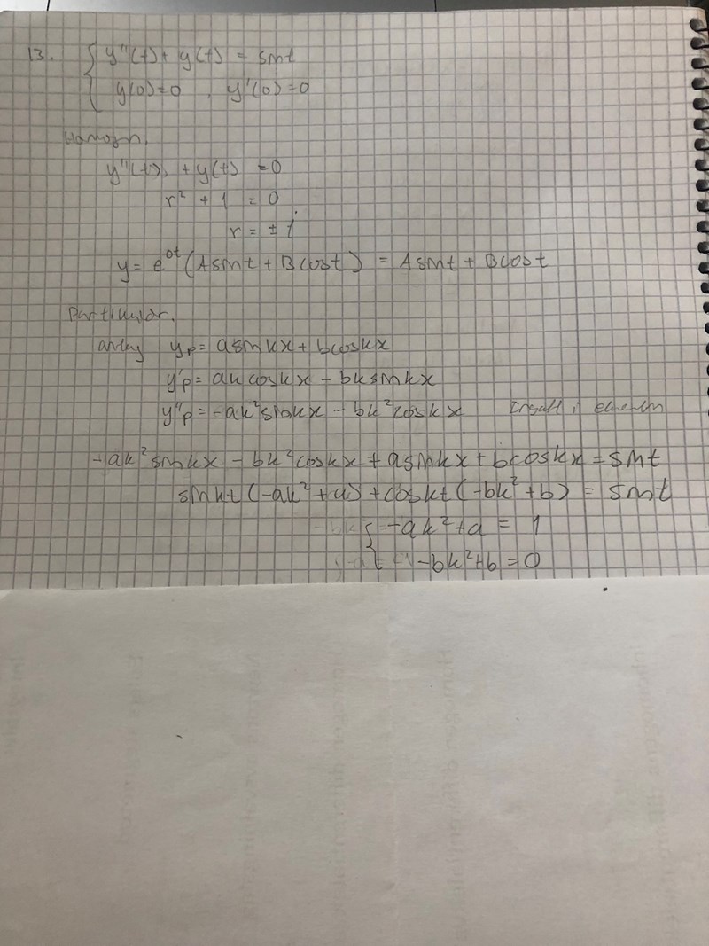 som ni ser får jag ett ekvationssytem och jag antar att k=1 eftersom att (-k2a + a)sinkt = sint. Insatt i ekvationen får jag att -a+a = 1 vilket inte stämmer. Hur går jag vidare?