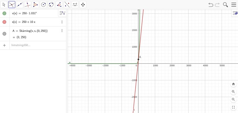 Jag tänkte att värdet på myntet är det samma när funktionerna är lika med varandra. Därför använde jag geogebra för att lösa frågan grafiskt: