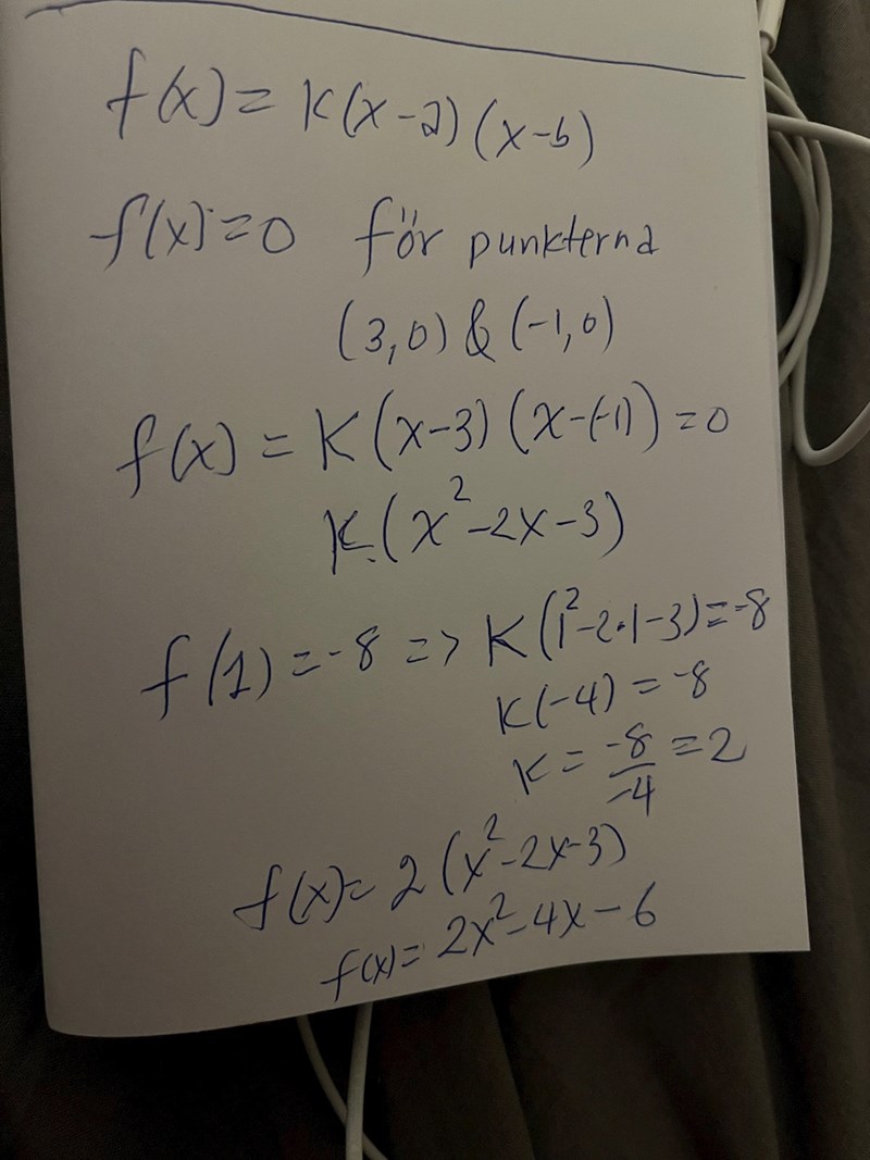 Jag vill skriva en ekvation till grafen på bilden med hjälp av ekvationen k(x-a)(x-b) men vet inte riktigt hur jag ska gå till väga. Jag har ju flera punkter, (0,-6) (3,0) (-1,0) och (1,-8) Hur ska jag ställa upp det?