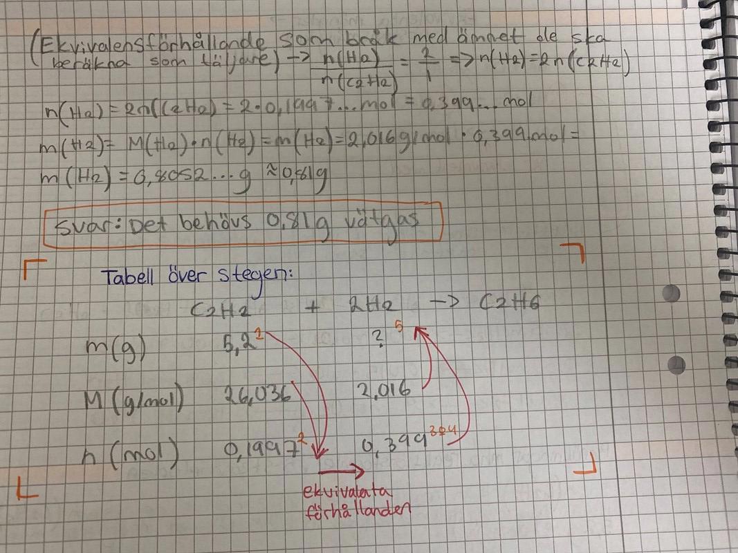 Etan (c2H2) kan reagera med väte och bilda etan (c2H6). Hur många gram vätgas behövs för att reagera med 5,2 g etan?”