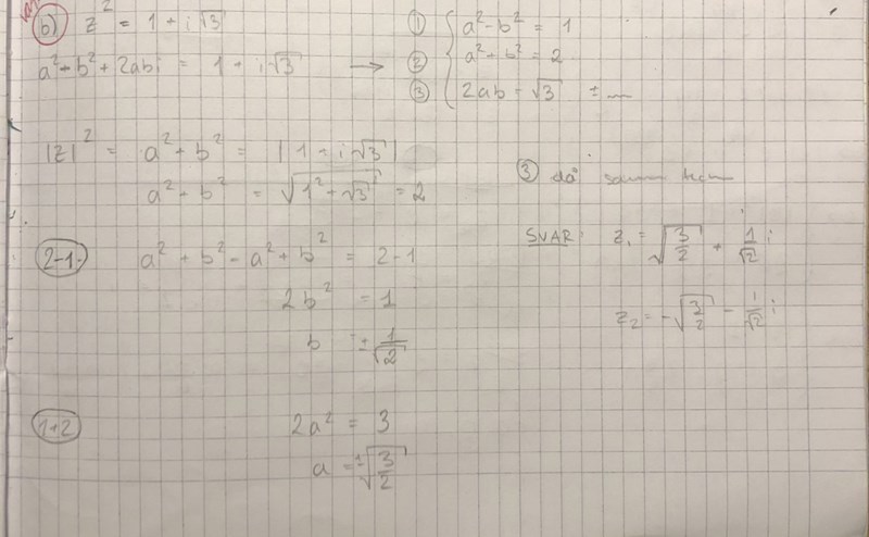 Har alltså först satt z=a+bi, och fått 1)+3) i ekvationssystemet till höger. Sedan skapade jag hjälpekvationen genom att ta absolutbelopp av HL och VL, och vid 2). Till sist använde jag olika kombinationer från ekvationssystemet för att få a och b. Eftersom att 3) har samma tecken måste även a och b ha detta, som jag satte in i z1 och z2.
