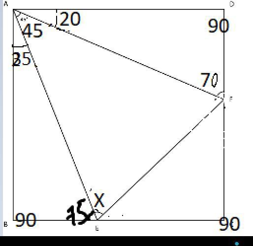 Vinkeln ∠EAF=45° och ∠AFD=70°. Vinkeln ∠AEF=x. Vad är vinkel x?