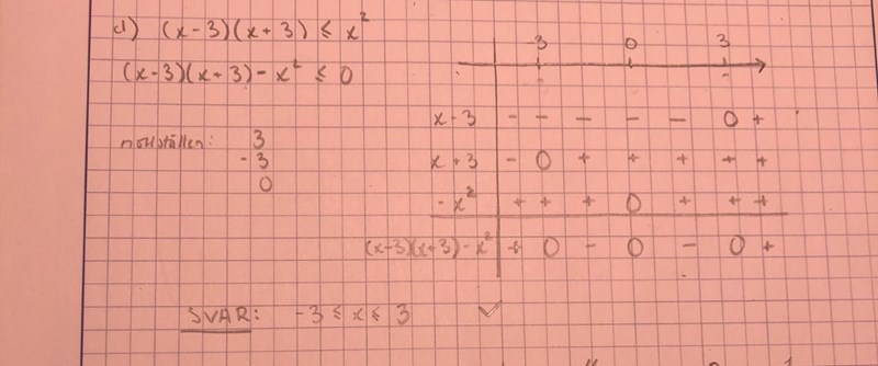 jag försöker lösa olikheten (första ledet i uträkningen) men kommer ej fram till korrekt svar, som ska vara att alla x fungerar. Hittar ej felet själv och har försökt göra som föreläsaren med teckentabell.