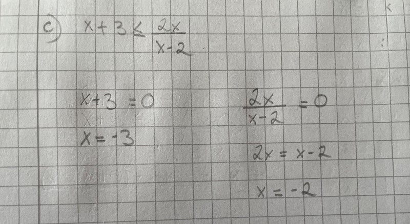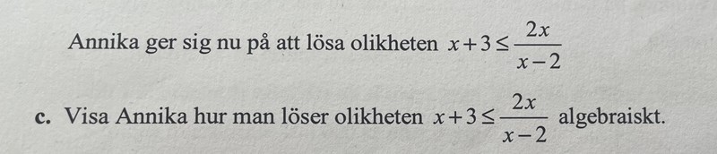 Smaragdalena skrev:Du måste dela upp olikheten i två olika fall. Om det är så att nämnaren x-2 är negativ, så måste man vända på olikhetstecknet (men inte annars).