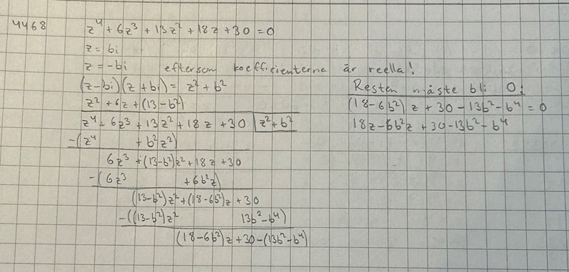 Jag har påbörjat en lösning och kommit så långt att jag antar att en rot är bi och därmed är även -bi en rot. Sedan har jag multiplicerat dessa rötter och gjort polynomdivision. Resten måste sedan bli noll och jag tänkte att man då kan bestämma b, för att sedan lösa ekvationen. Se bild nedan: