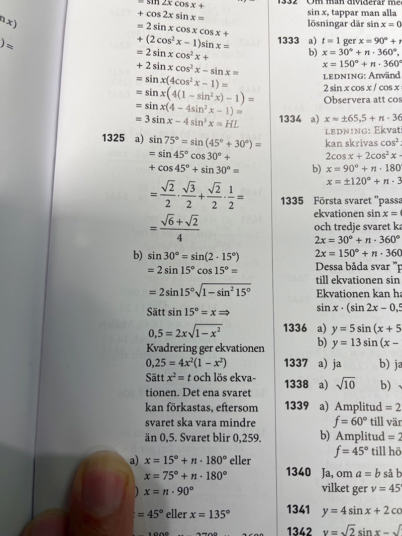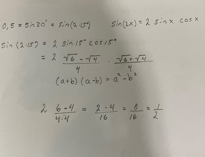 Jag har en fråga gällande en uppgift där man ska använda sig av sambandet 0,5 = sin 30 grader = sin (2*15grader). I facit använder dem sig av trigonometriska ettan. Alltså: