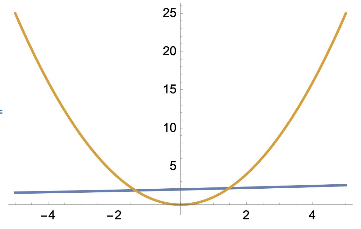 Detta stämde, men facit har två svar till. Jag vet inte hur jag ska få fram dessa. Det fanns inget "lös" alternativ i geogebra som det brukar. Borde det inte finnas fler skärningspunkter? Någon som kan hjälpa?