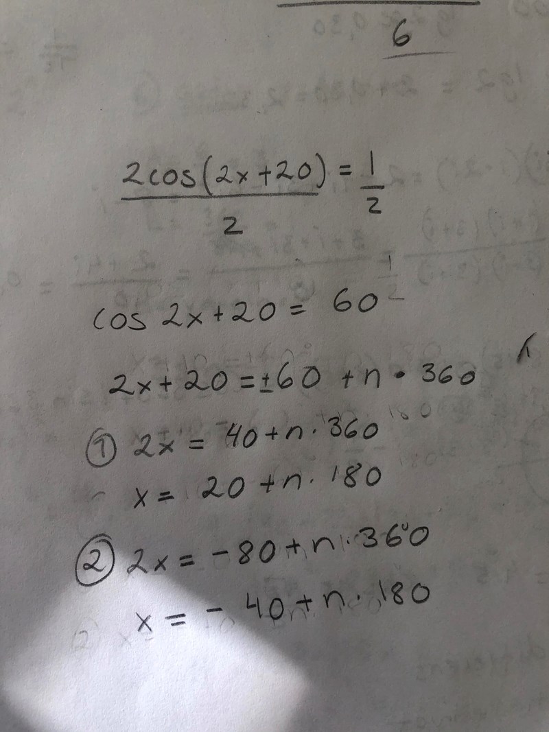 Ja, när du tar bort cos måste du lägga på +360*n för att få med alla varv. Så då hänger den biten med vidare i uträkningen sen och kommer att delas med 2 samtidigt som x.