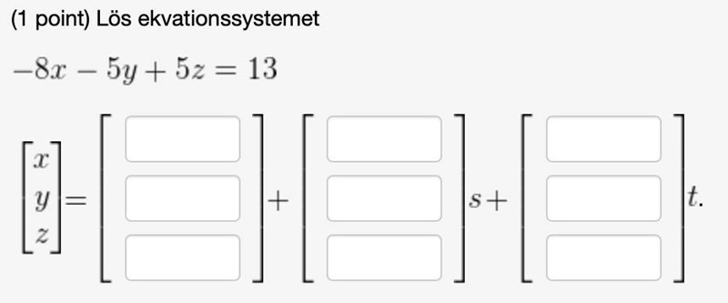 Man kan ignorera den geometriska tolkningen också, och bara lösa på som vanligt tills det tar stopp. Det tar stopp ganska snabbt här, och då kan man använda de variabler som är kvar som parametrar (dvs. döpa om dem till s och t som parametrarna kallas här).
