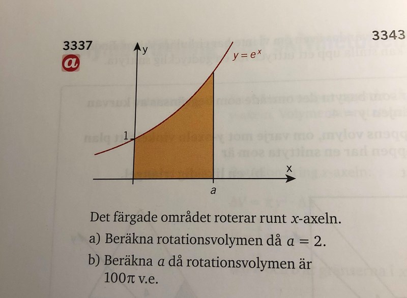 Hej! Jag har en uppgift där man ska beräkna a då rotationsvolymen är v.e.