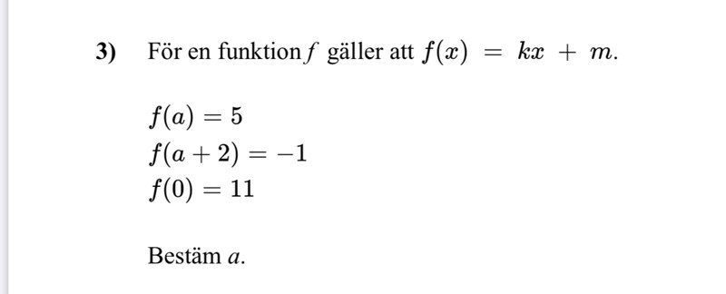 Eller ska man sätta in a istället för x? Så om f(a)=5 och ekvationen är f(x)=-3x+11 så blir det:
