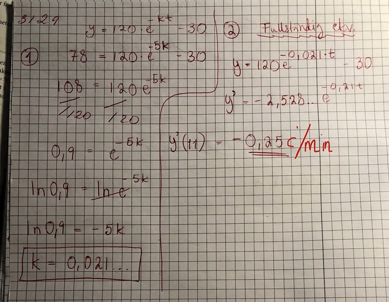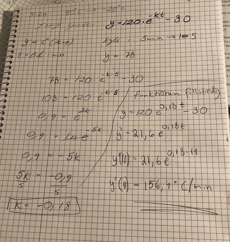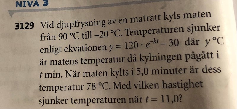 Jag tänkte att jag läser ut k först. Sen stoppar jag in den i den vanliga funktionen, sen deriverar den och sist stoppar in t=11.