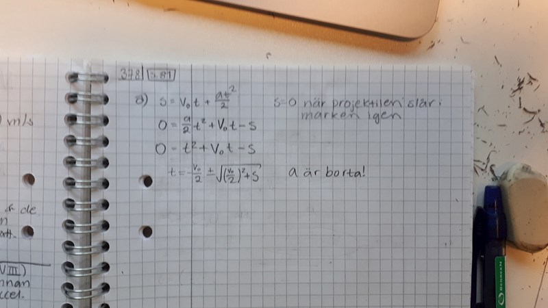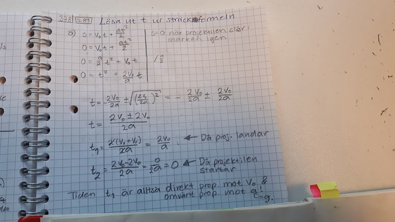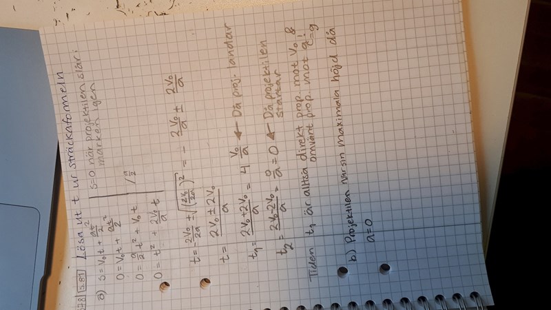 Den handlar om hur en projektils tid i luften (och b-uppgift: maximala höjd) påverkas av starthastigheten och tyngdaccelerationen - men just nu behöver jag mest hjälp med att lösa ut t. Jag har suttit i en timme utan framgång och blir nästan smått galen...