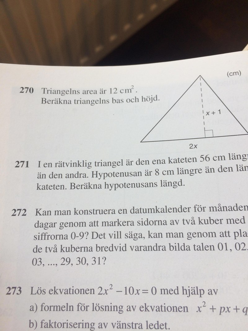 Har följande problem. Beräkna triangels bas och höjd. Triangelns area är 12 cm.