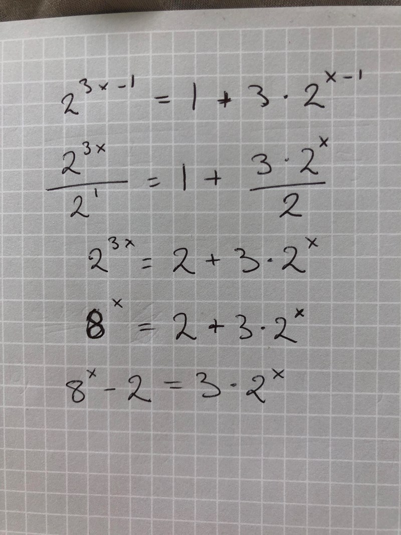 lös 23x-1 = 1+3•2x-1 (utan hjälpmedel)