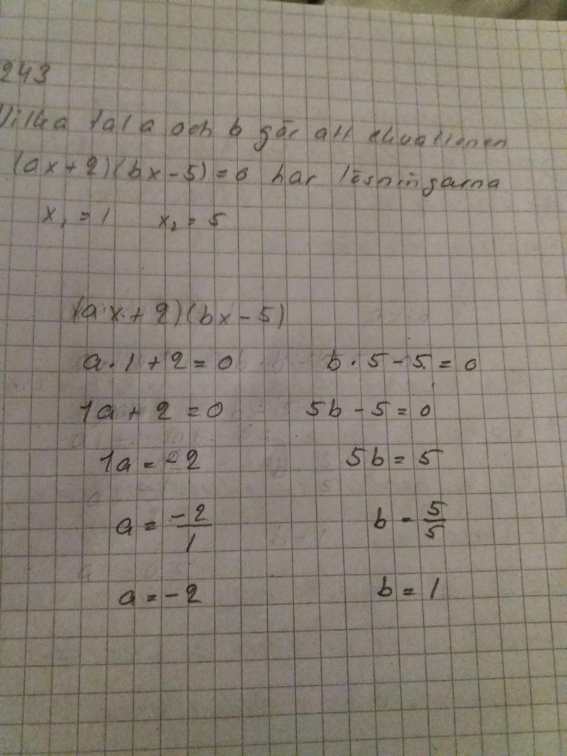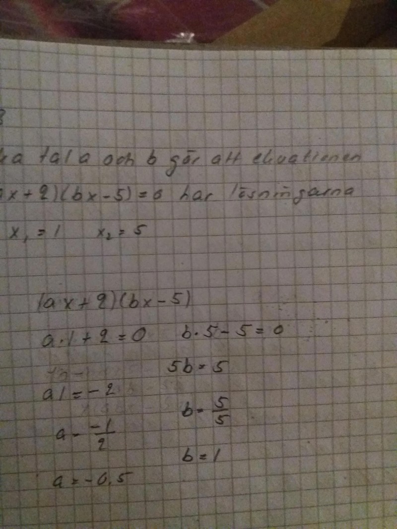 Sätt alltså in dina förslag på a och b i ursprungsekvationen och verifiera att den då får lösningarna och .