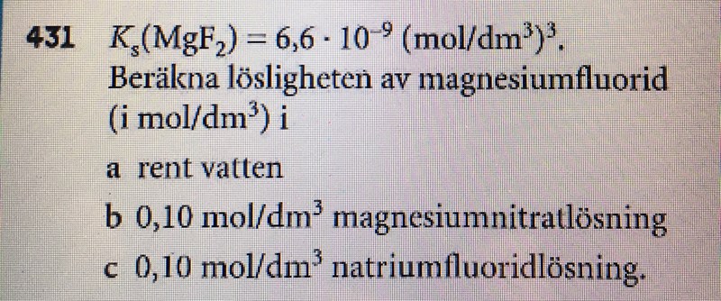 Vilket blev rätt svar men borde man inte plussa in fluoridjonerna också eftersom man ska beräkna lösligheten av magnesiumfluorid och inte endast magnesiumjonerna?
